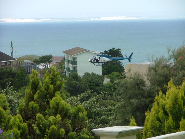 I was visiting a friend yesterday, whose house overlooks the same valley that is featured in our first post. They have spectacular views right across the bay. On a clear day the unspoilt dunes on the other side show clearly. Suddenly the view from the window was filled by a helicopter, hovering outside. We went to check out what was happening… and it was the Police, hunting for a criminal hiding in the bushes to the left of Albany Road, and showing the dog unit where to go. (To see more photos of the incident, you can go to Sue’s blog.)