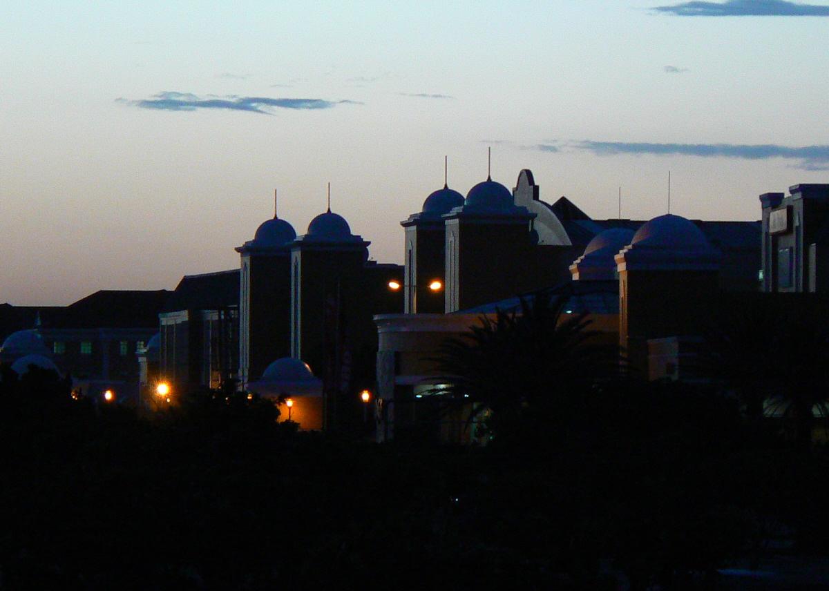 This is a view from the rooftop parking at Greenacres Hospital, looking across towards the north west just after sunset. The domed towers are part of The Bridge Shopping Mall, which literally does form a bridge across a major road heading down to the sea.