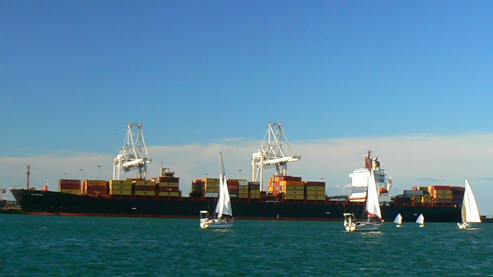 From the sublime to the ridiculous! We were on a 34 foot yacht, which is big enough to travel round the world in (admittedly you would need to have a screw loose in the brain to do it, but still!!) Two kids were having a ball scooting around in TINY little boats which were dwarfed by the big boys toys. That is until we all sailed past the container ship, and things were suddenly brought into perspective. The harbour here is too narrow to accomodate the new breed of container vessel which are 4 times the size of this one, so size really IS a relative thing!