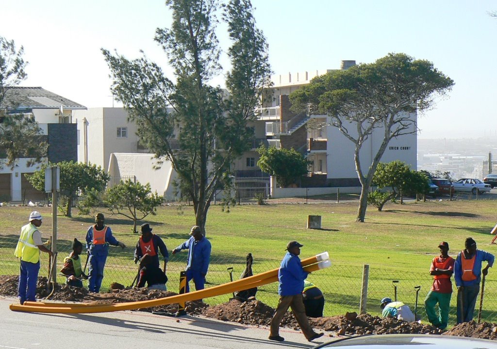 The other morning there was a sudden racket outside our front windows, and investigation revealed that the edge of the park was being dug up. Later on, I saw the orange pipes being dragged along, which confirmed my theory…. this is our turn in part of a huge operation to lay an entire new network of telephone lines throughout the country, for Neotel.