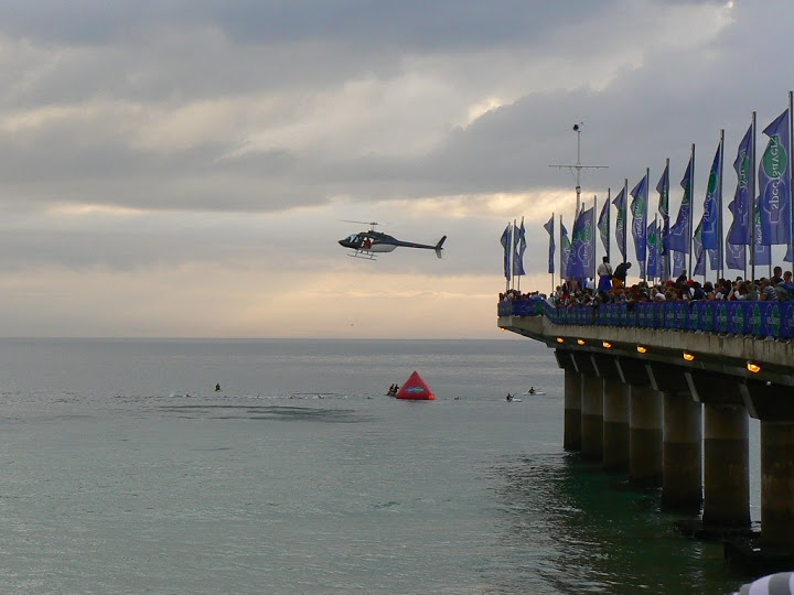 As there was a bank of clouds over the sea, the sun was not yet up. The pier was thronged with crowds waiting to cheer the competitors on, while the press hovered overhead.