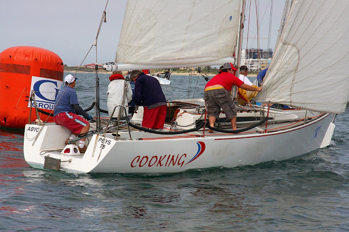 Glad I never sent you the shot of us on Cooking broaching (putting the yacht on it’s side in the water) after finishing one of the races in high winds!BLUSHJust in front of me is Bayer, 62 year old mother of David Rae, an America’s Cup Team Shosholoza Sailor who was sailing on Warrior. Bayer took part in the J22 Worlds this year and has been sailing on and off with us since we met her in Rio on the Cape to Rio in 2000.