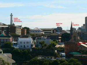 Continuing our look at PE’s eclectic skyline, from the same viewpoint as yesterday’s photo, but a bit to the West, you see another iconic landmark which we have featured before, the Donkin Reserve, with its lighthouse and pyramid. You also see a mixture of some of the earliest residences in town, mixed with more modern (30s to 60s) blocks of flats. In the far background, the ugly new post office building, (which blocks many potentially sweeping views of the bay from Richmond Hill!) on the old Main Street, now called Govan Mbeki Ave, which runs parallel to the coast. To the right is the main Roman Catholic Cathedral in town, St Augustines, and the peach coloured gable wall to the left of that, with white trim, belongs to the old Opera House. The curved stone gable wall in front of the cathedral is part of the Feathermarket Hall where auctions of ostrich feathers were held in the early days.