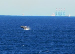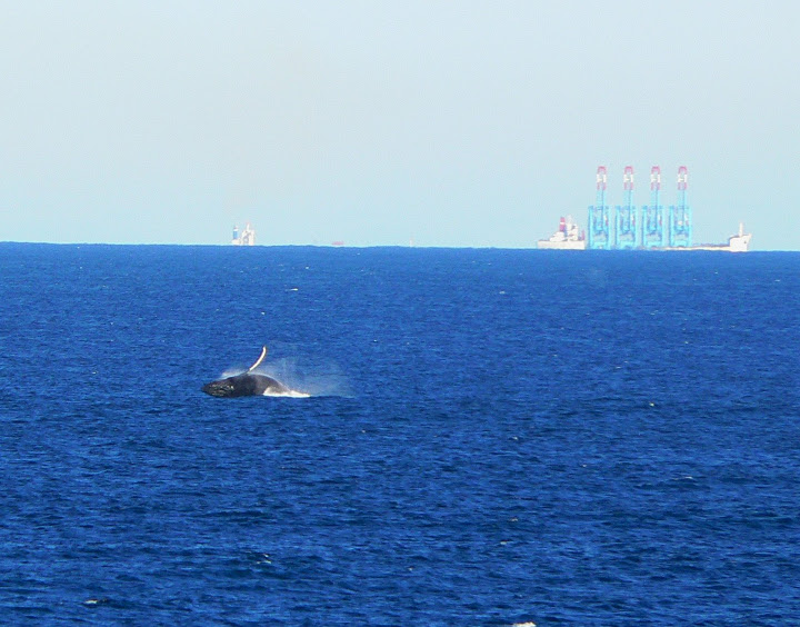 If you are anywhere near the Southern coast of Africa in the next two months, don’t forget that the whales are back! If you get a chance, take a drive along the coast and see if you can spot them. We went to Schoenmakerskop this afternoon, and had a wonderful time sitting on a bench, freezing our butts off and watching groups of them cruising past. We were delighted to catch a couple of them breaching. On the horizon there was an interesting ship with built in cranes travelling towards Capetown.