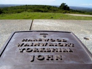 Along the circular wall of the Toposcope is a number of plaques pointing out the original farms. Each plaque has the following information (from the top):An arrow pointing out the direction, the distance from this point to the farm in miles, the name of the farm, the surname of the leader of the specific group, the county where they came from in Britain and the name of the boat they came on.
