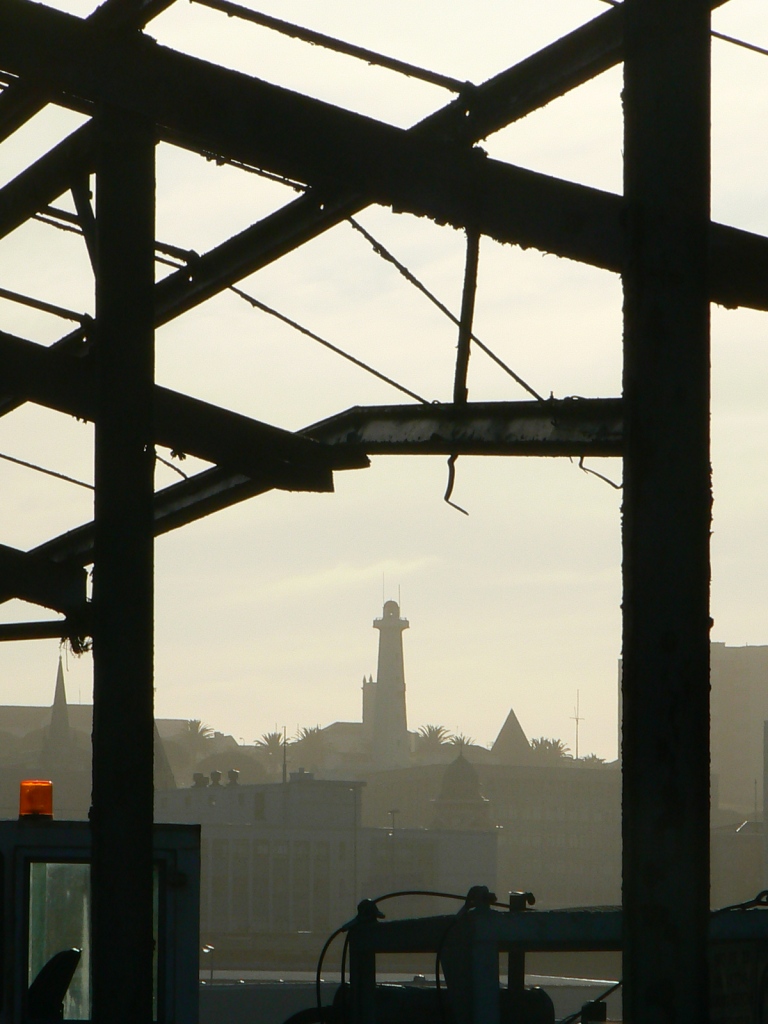 While we were visiting the beautiful ship Sagres, this unusual view of the Donkin Lighthouse presented itself, seen at sunset through an old metal warehouse structure.