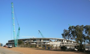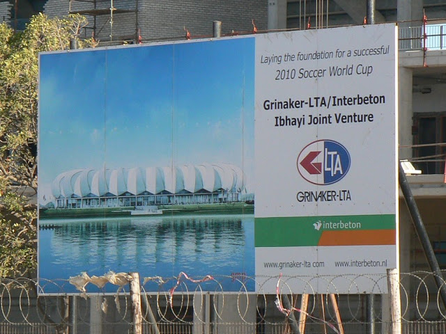 A visit to the site of the new 2010 Soccer World Cup stadium shows that great progress is being made to get it completed before the event. The giant crane to the left will be used to lift the massive roof trusses in place.