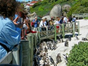 Boulders Beach is a sheltered beach made up of inlets between granite boulders, from which the name originated. It is a popular tourist stop because of a colony of African Penguins which settled there in 1982.