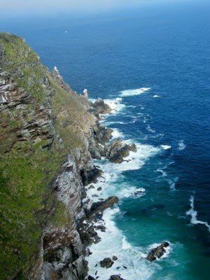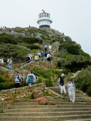 From the Cape Point car park a funicular railway takes visitors up (or you can walk up) to the old lighthouse on the highest point overlooking the sea. The old lighthouse was replaced by a new one because it was at a height where it was ofter shrouded in fog and clouds. Due to this problem many ships was wrecked along this point. The best known one was the Lusitania which ran aground on Bellows Rock in 1911. The view from the top is awesome with towering cliffs falling away more than a hundred meters.