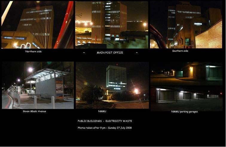 Amazing that people still feel the need to light everything up all night!! As if the Post Office does any work after dark… At least NMMU has MOST of the admin block lights off… As far as the parking areas and walkways are concerned, I guess you have to rememebr that students live on the campus too, and sadly it’s not an ideal world and nice dark parking garages and walkways are the perfect place for people to get attacked. I sat on the former PE Technikon’s disciplinary committee for years and attacks on campus were sadly quite common.
