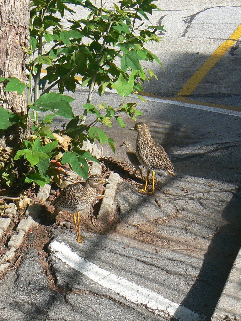 This family of dikkops were observed in Richmond Hill yesterday. Despite their natural habitat being systematically eroded by urbanization, these birds have managed to adapt well to city life. Normally they will be found in open fields, but these birds have somehow ended up in a very built up area, where there is a risk to the chick, from cats and dogs.