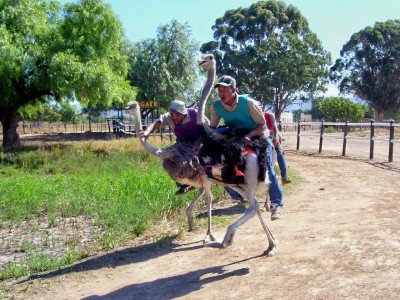 Around Oudtshoorn some of the biggest tourism attractions are the ostrich show farms. You can’t visit the area without going to one of the show farms. Here visitors are showed everything there is to be known about the ostrich. From breeding to their legs, feathers and heads and then what products you get from ostriches. Then its on to the camps where visitors can have the opportunity to stand on an ostrich egg, touch an ostrich, sit on one or (if you weigh less than 75kg) even ride one. At the end of the visit professional ostrich jockeys (how many people can put that on their CV’s) will do an ostrich race for the visitors. Here Michael Schumacher on the right and Hopeless on the left is having it out for first place.