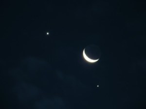 Looking to the west the moon was flanked by two bright stars. To the left and slightly above the moon was Venus, the evening star, and below to the right was Jupiter.