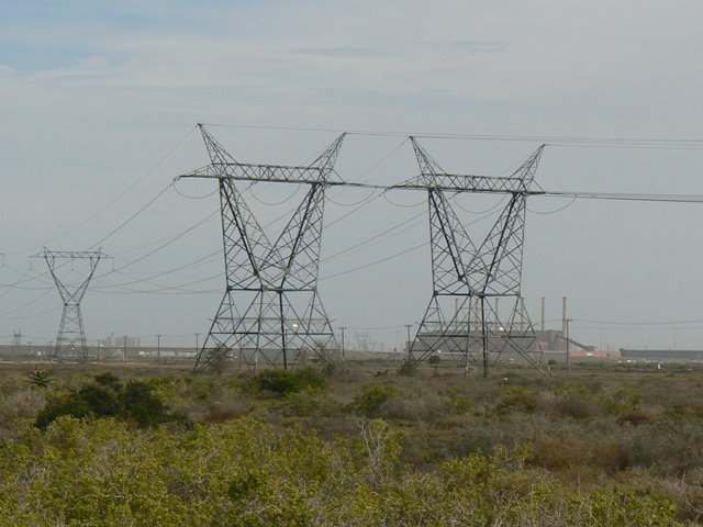 Some of the power lines that bring electricity to Port Elizabeth from the Eskom power stations in Mpumalanga. In the background is the now defunct Swartkops Power Station. It would have been an ideal source of backup power for the city, had the decision not been taken to mothball it and sell off the plant for scrap metal.