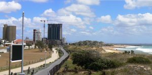 The municipality has worked very hard to make our beachfront user friendly for all sorts of people. From this viewpoint at the bottom of Admirality Way, you can see the cycle track and raised wooden boardwalk for pedestrians. You can now walk or cycle comfortably all the way from Kings Beach to beyond this point. You can also see the new Radison hotel taking shape on the left of Marine Drive, and the Summer Seas complex which, controversially, replaced the old Summerstrand Hotel, on the right.