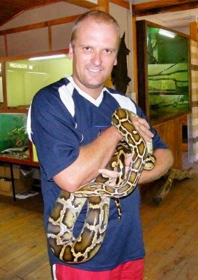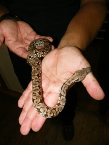 The best part of the visit starts when the guide takes out the non-venomous snakes. Then the fun starts. Here he is holding a baby boa constrictor.