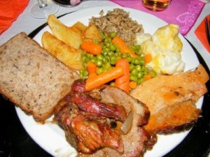 Clockwise from the top: Rice (cooked in stock with onions and lots of pepper), cauliflower with white sauce and cheese on top, pork roast with sweet and sour sauce, lamb roast with gravy, whole wheat bread, roast potato wedges and peas and carrots in the middle. *lip smack*