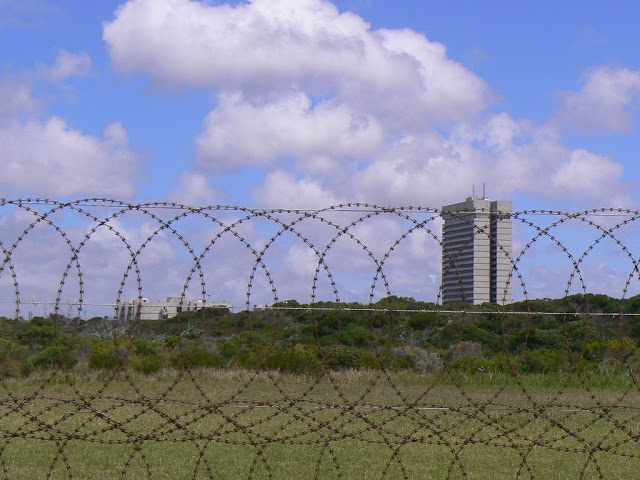 The buildings are a classic example of what is now called “brutal architecture”, the raw concrete edifices that were considered the height of modernity in the 70s. They are very spread out, the original intention was to have a built in transport system, but this never materialised. The buildings are set in a large nature reserve, protected by the ubiquitous security fencing. They have done a good job of clearing the alien vegetation and establishing indigenous plants to stabilise the sand, and there is quite a selection of wildlife to see as you drive past. (we tried to capture some springbok for you, but they were a bit far away so it wasn’t the most exciting photo!)