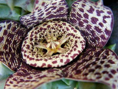 There are different types of carrion flowers and this one comes from the genus Stapelia. This specific species are small, spineless, cactus-like succulent plants. It is native to South Africa, but apparently grown as potted plants elsewhere.