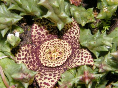 The flowers of all species are hairy to varying degrees and generate the odor of rotten flesh. Because this one is so small, you don’t smell it from afar, but when you get your nose close to it, the smell is quite clear. The colour of the flowers also mimics rotting meat. This attracts scavenging flies who then pollinates the flowers.