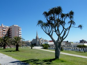 This picture was taken facing away from the Donkin Pyramid and lighthouse towards Donkin Street. The church in the background is The Hill Prespetarian Church with the Donkin Street Houses from the middle to the right of the picture. The tree in the foreground is a Tree Aloe (Aloe barberiae), which is normally found in thickets, kloofs and savanna in the east of South Africa. Donkin Reserve tree aloe