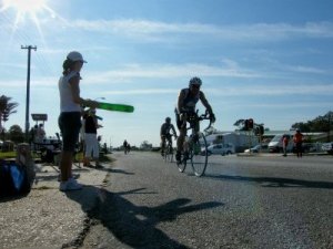 They swim two laps before coming out the water into transition before the cycle. There was a hole in the shallows and a couple of the competitors had a bit of a dive after the fact.