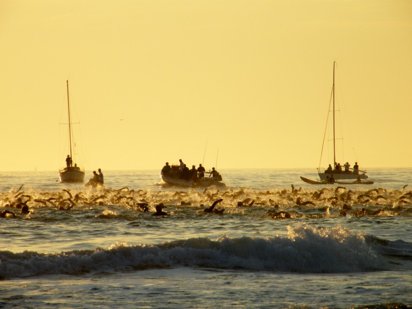 The competitors setting off on the swim leg of Ironman South Africa from Hobie Beach