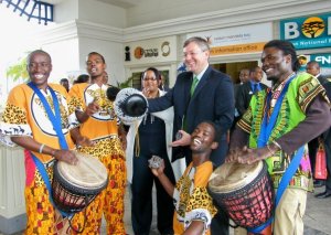 In the picture is the Minister, Marthinus van Schalkwyk, the Deputy Minister, Thokozile Xasa, and the drummers from African Drumbeat.