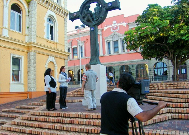 I was fortunate enough to be asked to be part of a shoot for the SABC 2 Afrikaans magazine show Pasella today. Along with my colleague S, I got to take the the presenter, Vicky Davis, and the crew on a walkabout along some of the places on the Donkin Heritage Trail. Here we are standing at the Prester John monument across the road from the Feather Market Centre.The show will be broadcasted in the first week of September.