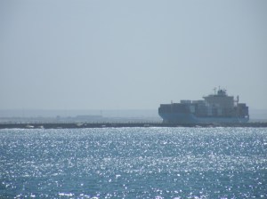 A big container ship entering the Port Elizabeth harbour as seen from the pier at Hobie Beach