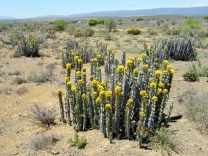 The Karoo is well known for its many different succulent species. Driving through some parts of the Karoo, specially around the Jansenville area, one will find a variety of euphorbia plants. One in particular stands out. The local euphorbia are smallish, thorny plants with a milky sap and are known as noors, giving the region its name of Noorsveld.