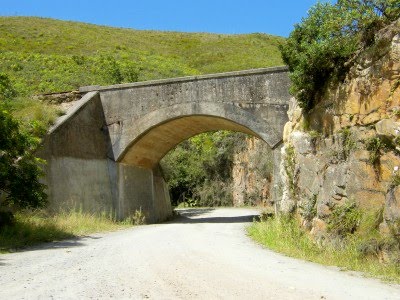 Very close to the top of the pass, the road passes under the railway line that crosses the Outeniqua Mountains. There is a spot on the railway line just past this bridge called topping which indicates the highest point of the line and the road.