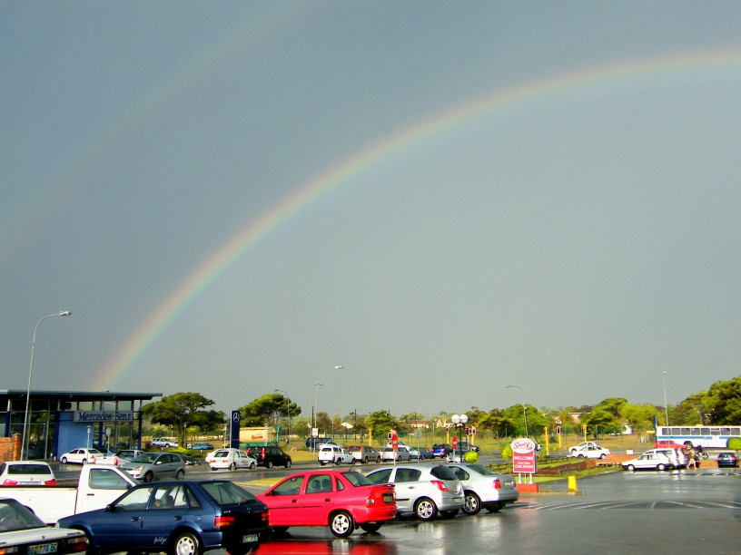 Yesterday afternoon the city was hit by a terrific thunderstorm that rained buckets in some areas. When it all came down I was in our local supermarket and it stopped just before I came outside. As I got to my car the sun broke through and this magnificent rainbow streaked across the sky.