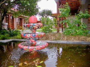 A mosaic decorated fountain in the fish pond at the luxarius Singa Lodge in Summerstrand. The lodge is named after the mystical dragon-lion of Indonesian mythology. The lodge is a luxurious modern fusion of Eastern & African architecture and décor is an artistic masterpiece and each one of the 12 suites are decorated differently.Courtyard fountain