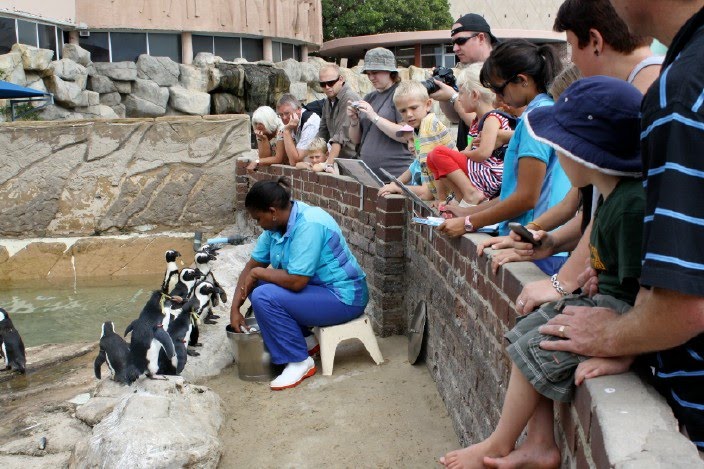 Bayworld series #7: Following the seal and penguin presentation at the big pool (featured yesterday), everybody moves over to the penguin enclosure to see the feeding of the penguins. They all came running when the trainers entered the enclosure. As the trainer was feeding she marked on a chart who has had and in this way nobody gets passed over. After feeding she told them to go for a swim and wash themselves and all the penguins headed straight for the pool.