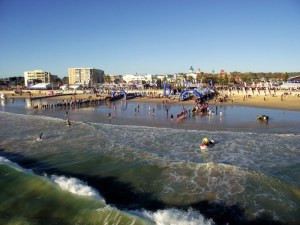 Probably the best spot to see the start of Ironman from is on Shark Rock Pier. This year I decided to be on the beach to get some close-up shots of the competitors starting their swim, but next year I definitively would like to get the start from up here. I decided to take a walk onto the pier to get a shot anyway. At this stage most of the swimmers were on their second lap of the coarse while the leaders were exiting the water.Ironman starting point