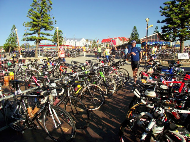 Ironman series #5: After the competitors exit the water for the second time, they leave the beach and move onto the Hobie Beach parking lot where the transition area was situated. Here the 1800 competitors collected their bikes for the 180km cycling leg. Seeing all the bikes lined up was quite a site and as I had media accreditation I thought I may be able to get in there for a couple of shots. Unfortunately I wasn’t able to so I took this pic through the fence surrounding the area.