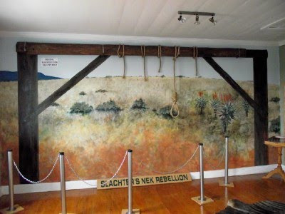 Four of the nooses broke during the procedure, as the hangman who came to perform the execution had not realised that there were five to be hung, and old rope had to be used. The four whose ropes broke, and the public, pleaded for their lives, but Col Culyer ordered that they be hanged a second time and more ropes were obtained. The picture above is part of the Slachter’s Nek exhibit at the Somerset East Museum.