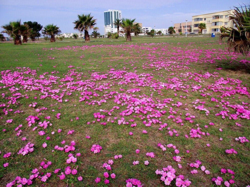 The lawns along Marine Drive between Hobie Beach and Pollock Beach is currently covered in pink flowers. Driving along the path at Lovers’ Lane one would think that spring somehow got stuck here. The big building in the background is the 5 star Radisson Blu Hotel.