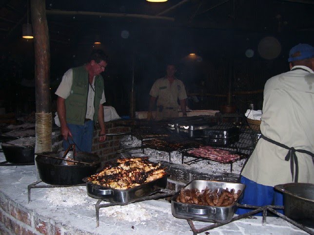 Most of the private game reserves around Port Elizabeth serve traditional South African foods to their guests. Some make it in their kitchens while others do it out in the open on the coals. At Schotia Safaris they prepare the food in their outside lapa in full sight of their guests. Schotia’s owner, Peter Bean, are very hands on in everything that happens on the reserve and in the picture he is braaiing (barbecuing) the lamb chops, chicken sosaties (kebabs) and boerewors (farmer style sausage) that is served as dinner.