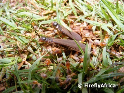 The Harvester Termite doesn’t build mounds, but nests completely underground. They collect grass and plant materials by night and on cool days which then gets transported underground into the nests. Winged “imagoes” (flying ants), which were what we were seeing that morning, emerges after rain. They fly short distances, shed wings and digs a chamber 25mm below the surface. The female would then attract males through pheromones and become the new queen of new colony.