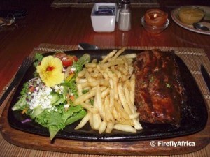 We kept the best for last. The Cooking Monster, also know as owner Geoff Applewhite, runs a restaurant from the lodge with a menu that includes kudu and ostrich steak as well as a wide variety of other dishes. We both settled for Geoff’s 300 gram rump steaks served with chips and salad. The Damselfly followed it up with cheesecake and I had pancakes with apple and cinnamon. The food was so good, I nearly chewed my lips off. Elephants Footprint Lodge comes highly recommended.