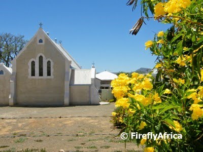 Yellow flowers in front of a church in Prince Albert in the Karoo