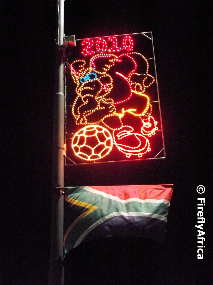 Outside the FIFA Fan Fest at St Georges, the municipality has put up festive lights for the occasion. The elephant refers to the fact that the Addo Elephant National Park is situated just outside Port Elizabeth and that provincial sports teams from the area use the elephant as their mascot.