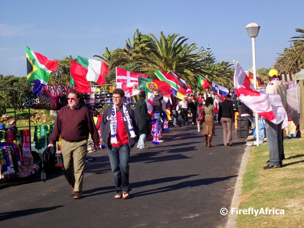 The Kings Beach parking area is one of the transport pickup points for the 2010 FIFA World Cup. The majority of soccer fans staying on the beachfront would thus make use of this to get to the stadium for matches. Obviously the soccer memorabilia traders figured that out before the event and have set up shop along the walkway where the Kings Beach Flea Market would normally trade from on the weekends. The walkway is a myriad of colours and flags from all the competing countries.
