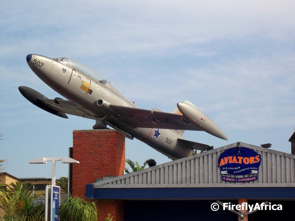 One of the slightly unusual sights outside the Port Elizabeth Airport is an Impala MkI sitting on top of a pillar next to Aviators Pub and Grill. It kinda looks like a scene from a SciFi movie with a spaceship docked at a space diner. The Impalas were used as training aircraft by the SA Airforce in the past and this one got a prime spot to retire at.