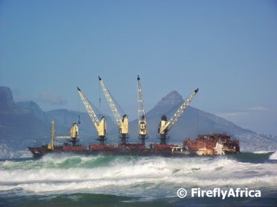 Lying just off the beach at Bloubergstrand in Cape Town for the last year or so is the wreck of the Turkish ship Seli 1. The Seli 1 apparently dropped anchor in Table Bay when the anchor broke off in large swells. The ship drifted towards shore and landed on a sandbank before being pushed onto rocks which punctured a hole in the side of the boat. Fortunately it didn’t cause any pollution along the coastline.