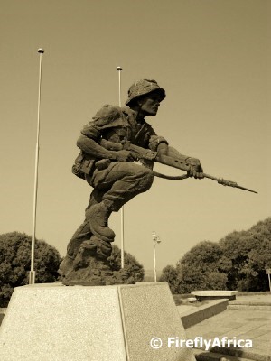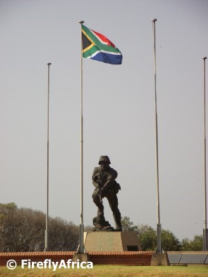 The South African Defence Force Memorial is situated just outside the entrance to Fort Klapperkop in Pretoria. The memorial was unveiled on May 31 1979 and includes a statue of a soldier holding a R1 rifle, in memory of all members of the South African Defence Force who lost their lives serving their country. The individuals who have lost their lives are honored with an inscription on a number of marble plaques mounted around the statue.