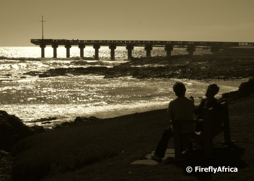 A couple of early morning Port Elizabeth beachfront strollers taking a break while enjoying the morning sun reflecting off the sea next to Shark Rock Pier at Hobie Beach.