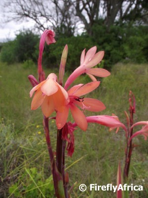 One of the 52 species of Watsonia (Bugle Lily) that we find in southern Africa.  The Watsonia is a type of iris native to South Africa. The genus is named after Sir William Watson, an 18th century British botanist.  They are perennial herbs growing from corms and producing erect spikes of showy flowers, and are adapted to a Mediterranean-type climate.